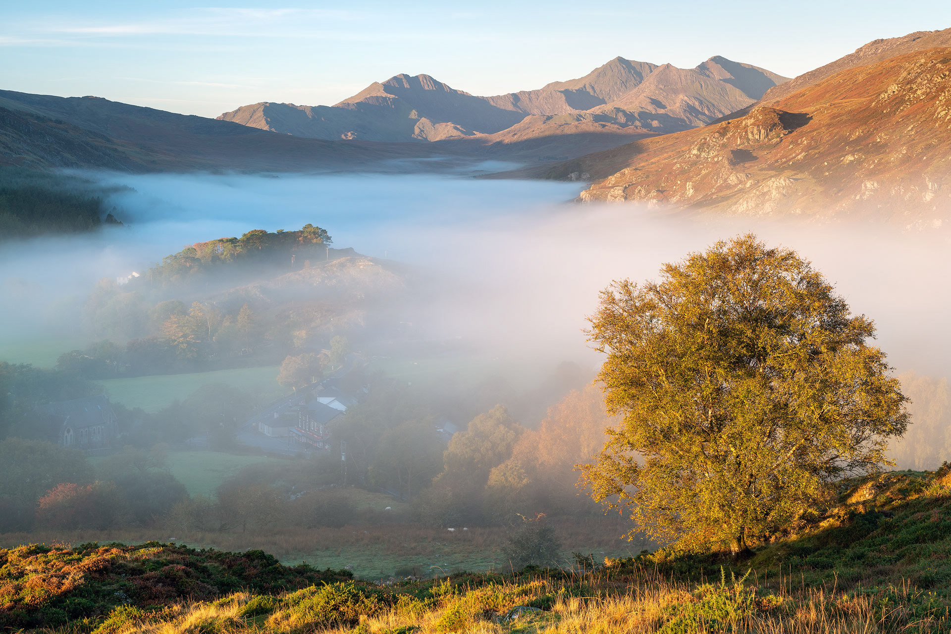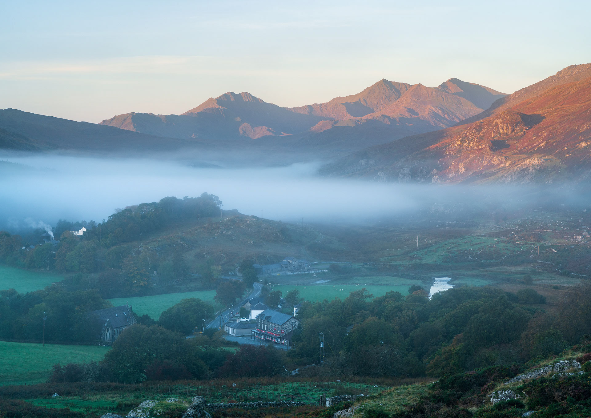 Snowdon is painted red by the rising sun as the valley below remains in cool shadow.