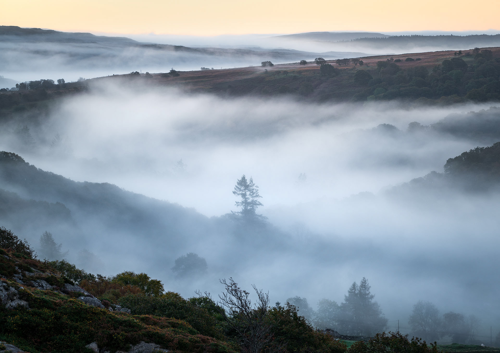 The view in the opposite direction along the Dyffryn Mymbyr valley. The fog slowly drifted amongst the pines as the rising sun transformed the landscape.