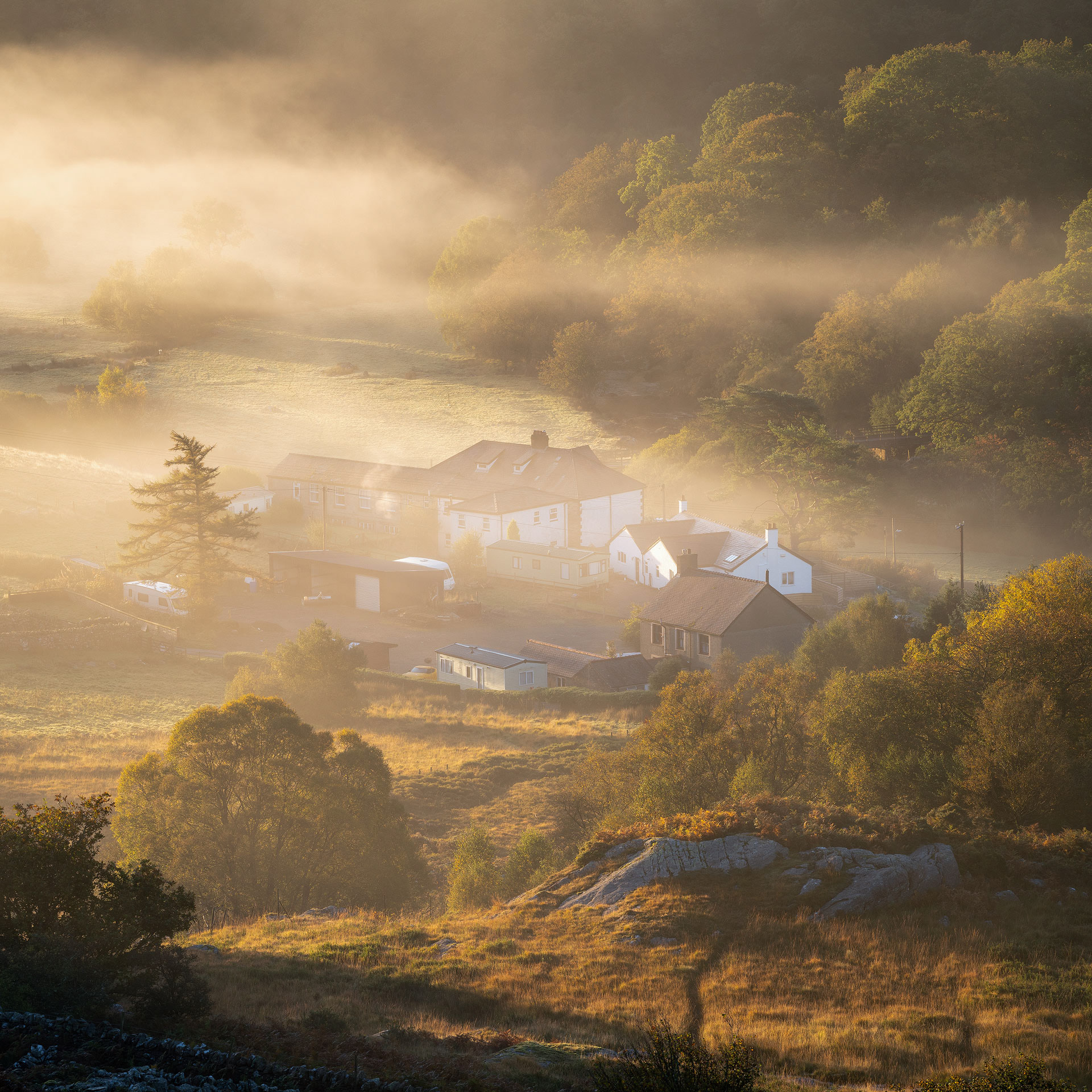 A wider view over the valley including an autumnal foreground, and The Rocks Hostel emerging from the mist.