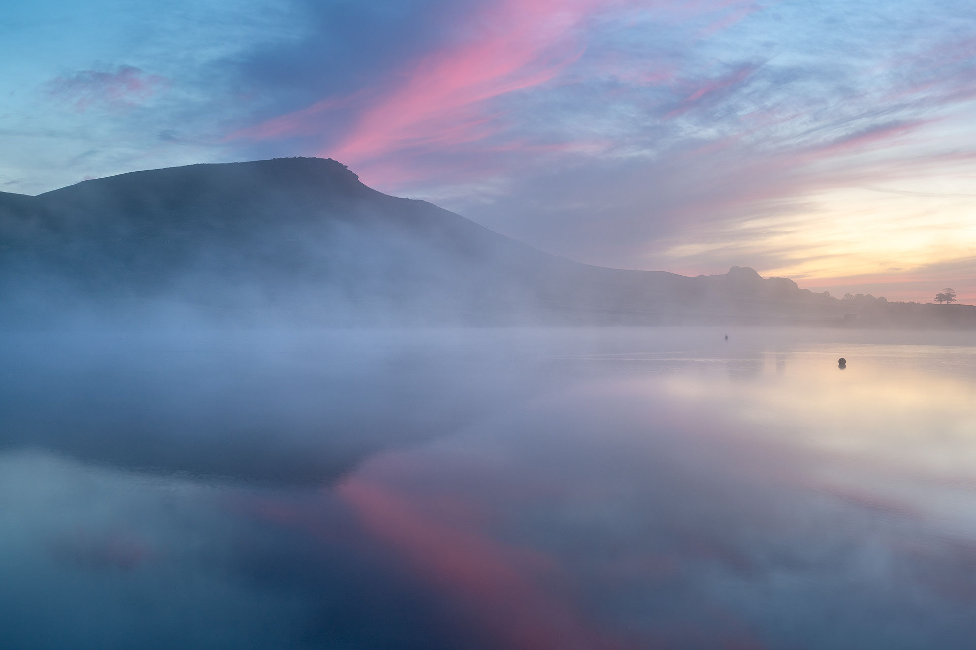Spectacular sunrise colour reflected in Embsay Reservoir and the Leeds & Liverpool Canal.