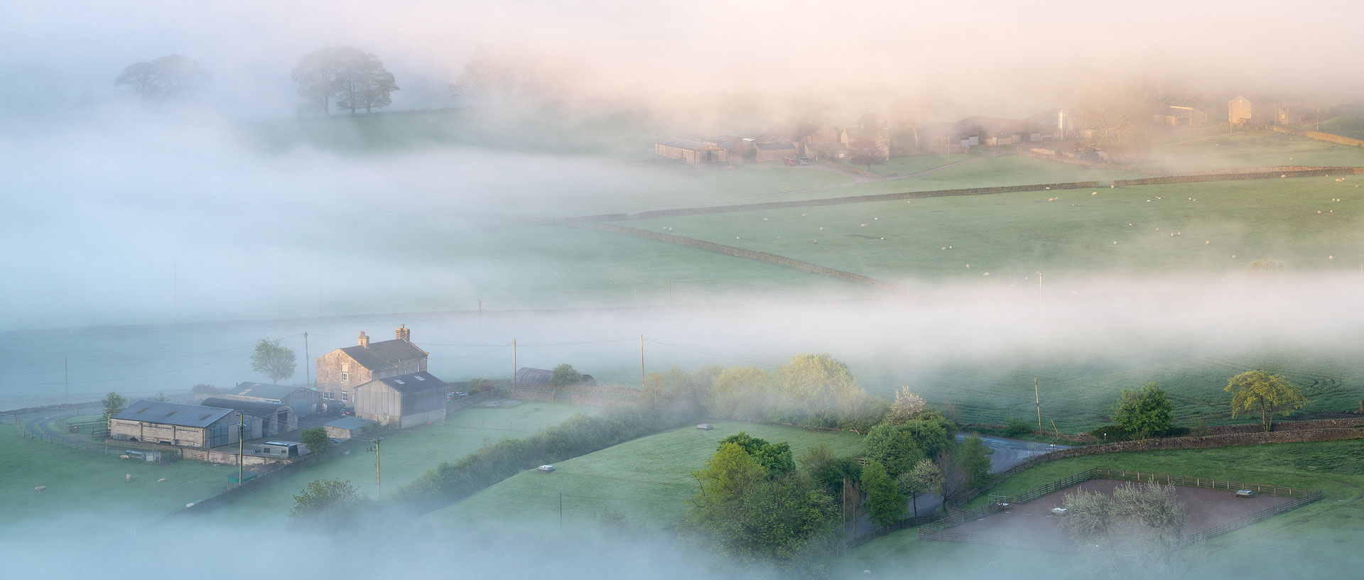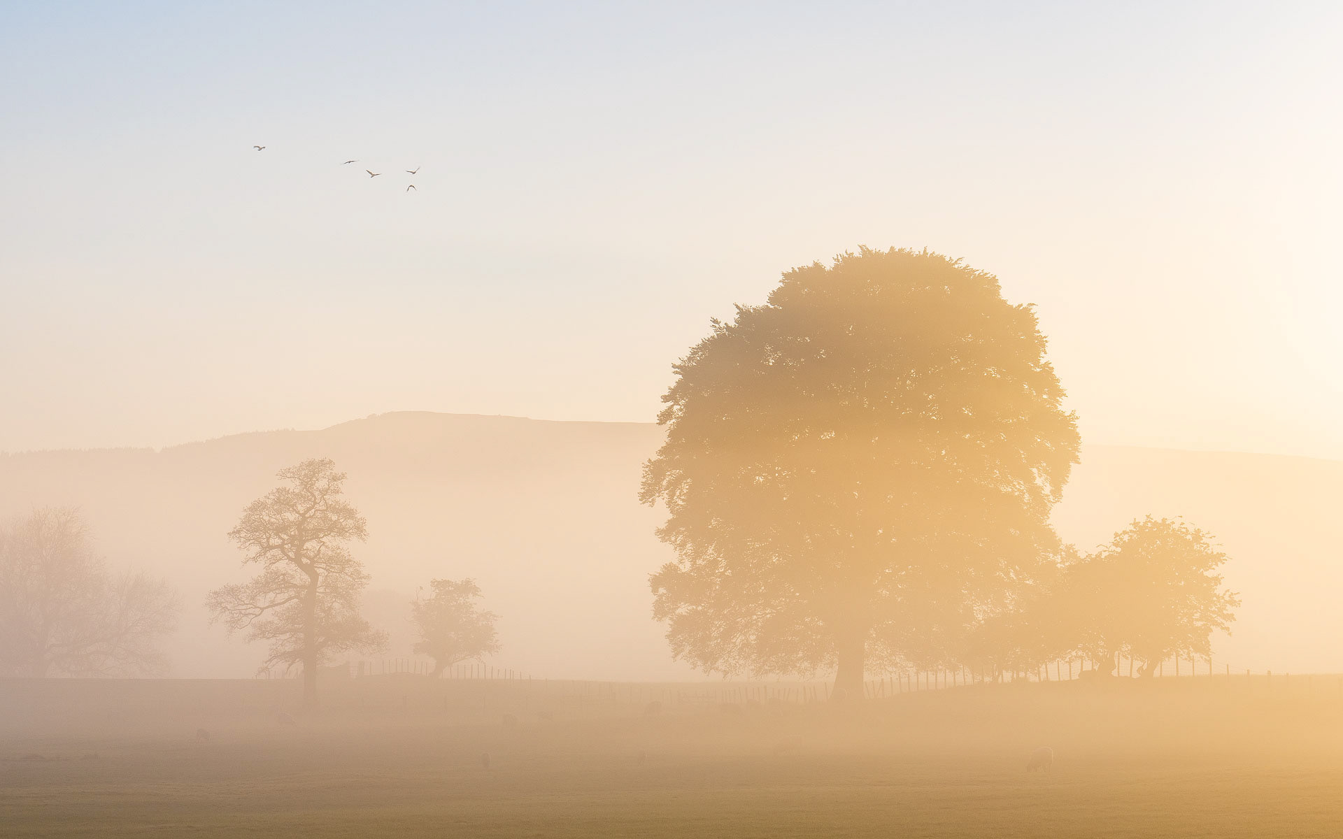 Golden morning light begins to penetrate the thick fog hanging over the fields near Broughton Hall.