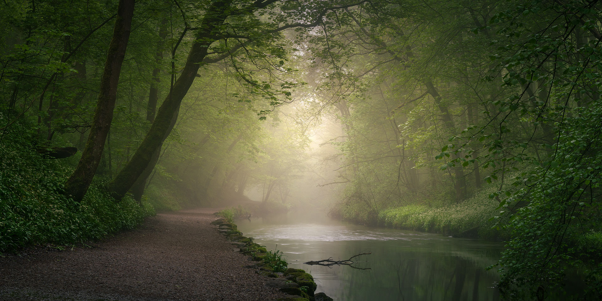 Wild garlic flowering under luminous spring greens in Skipton Castle Woods...