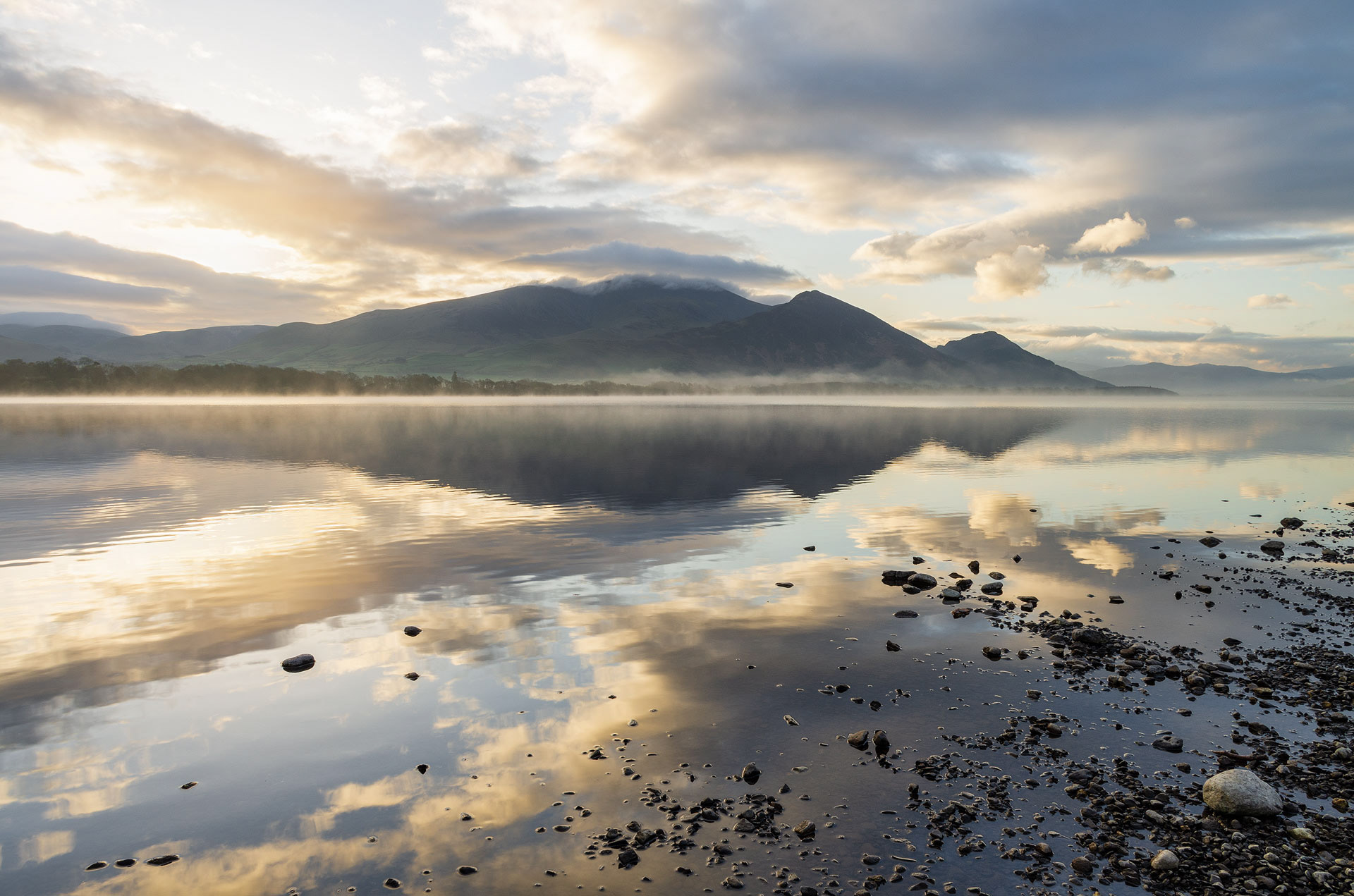 Isthmus Bay on a calm, cloudy morning and a brief burst of light frames Skiddaw behind Bassenthwaite Lake.