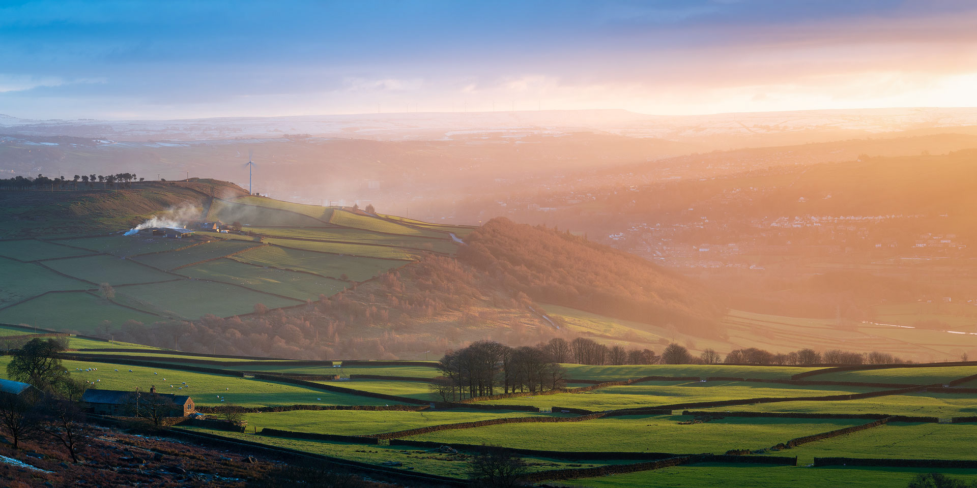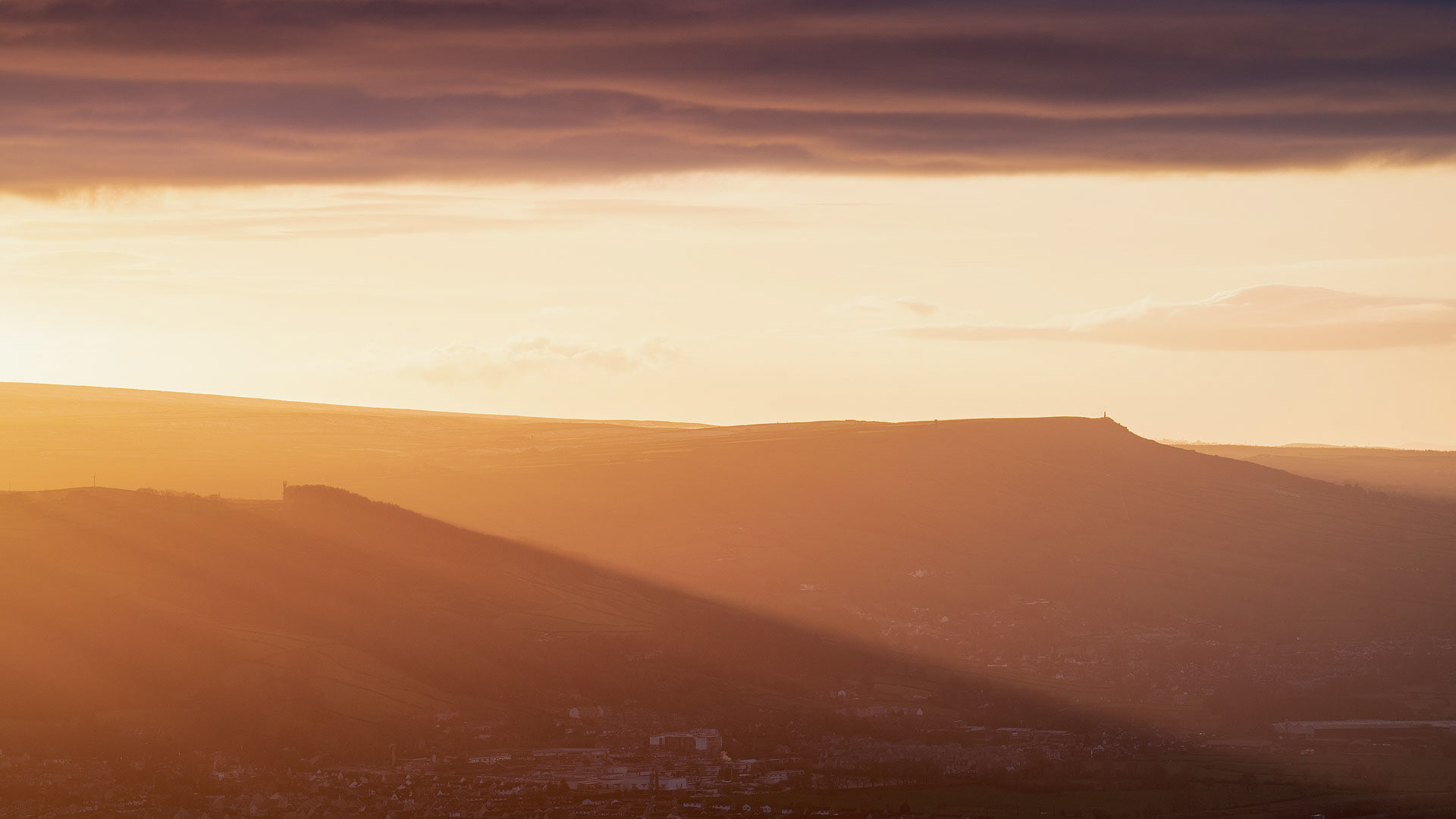 The view towards the Aire Valley captured from Nab End, with low winter light raking across the scene.