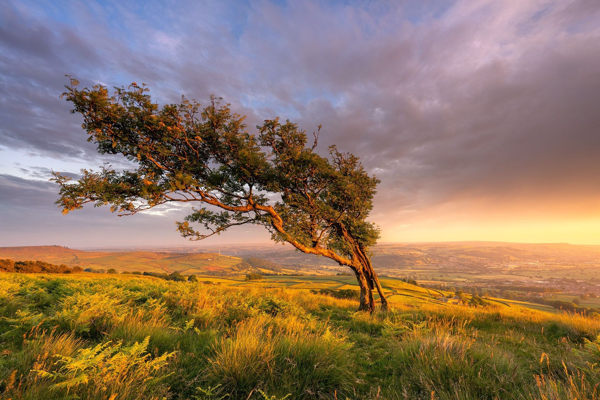 More views from Nab End. Dramatic light floods the winter landscape as the sun drops below a thick shelf cloud, and a lone tree is highlighted during the golden hour in summer...