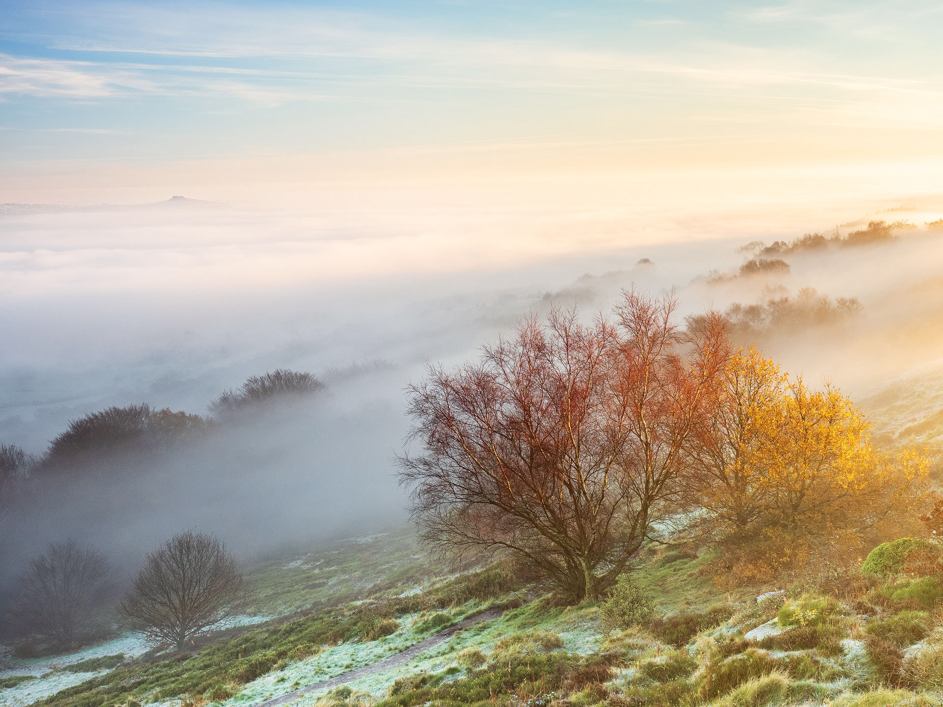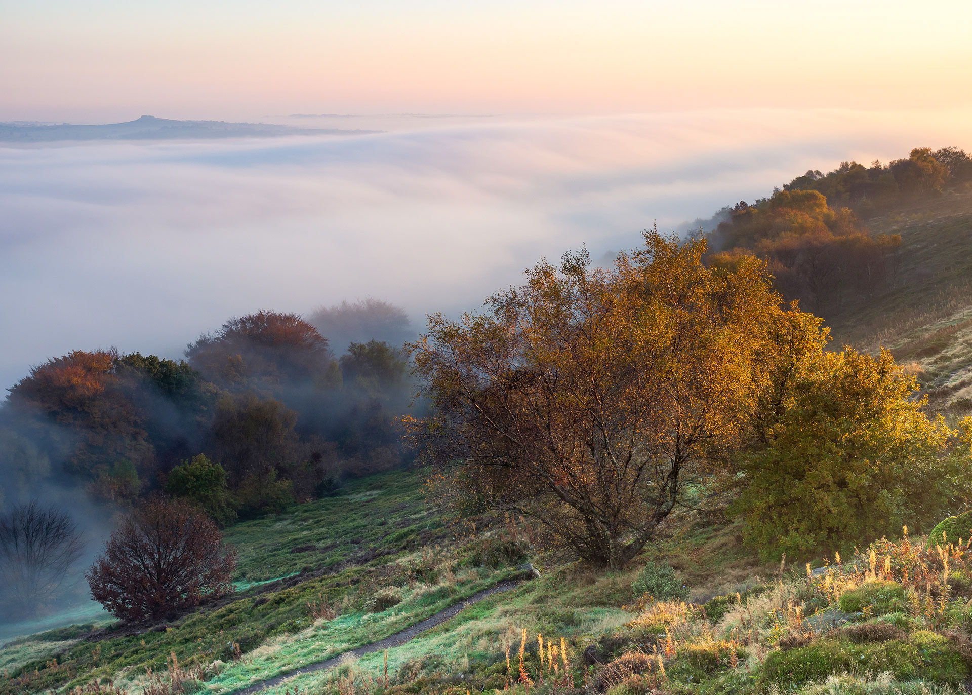 Direct morning light illuminates the autumn foliage as a temperature inversion drifts through the Wharfe Valley.